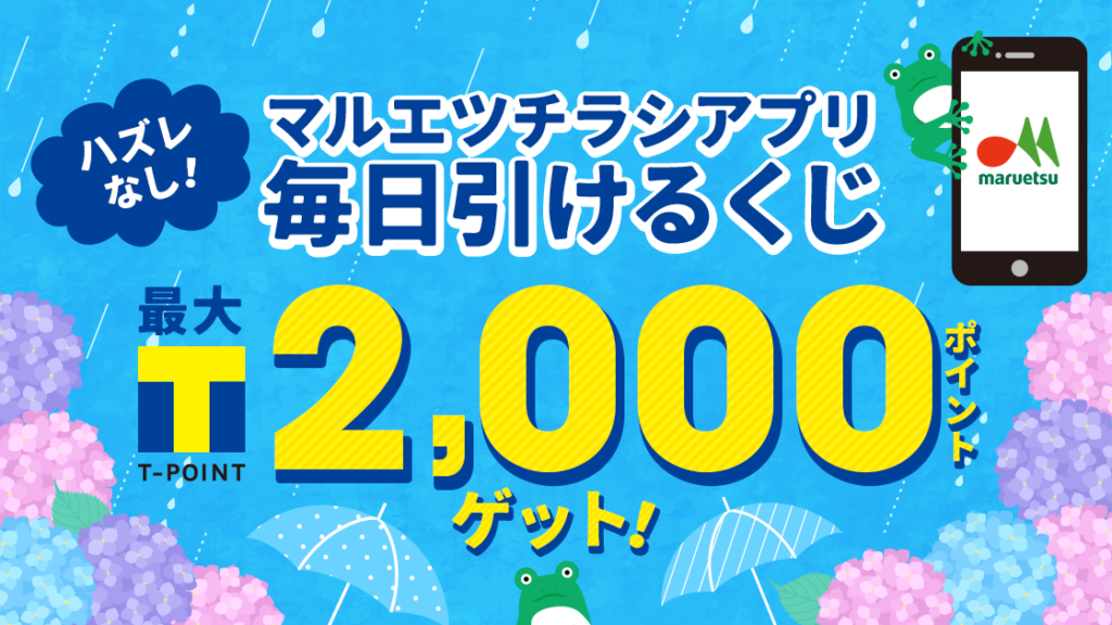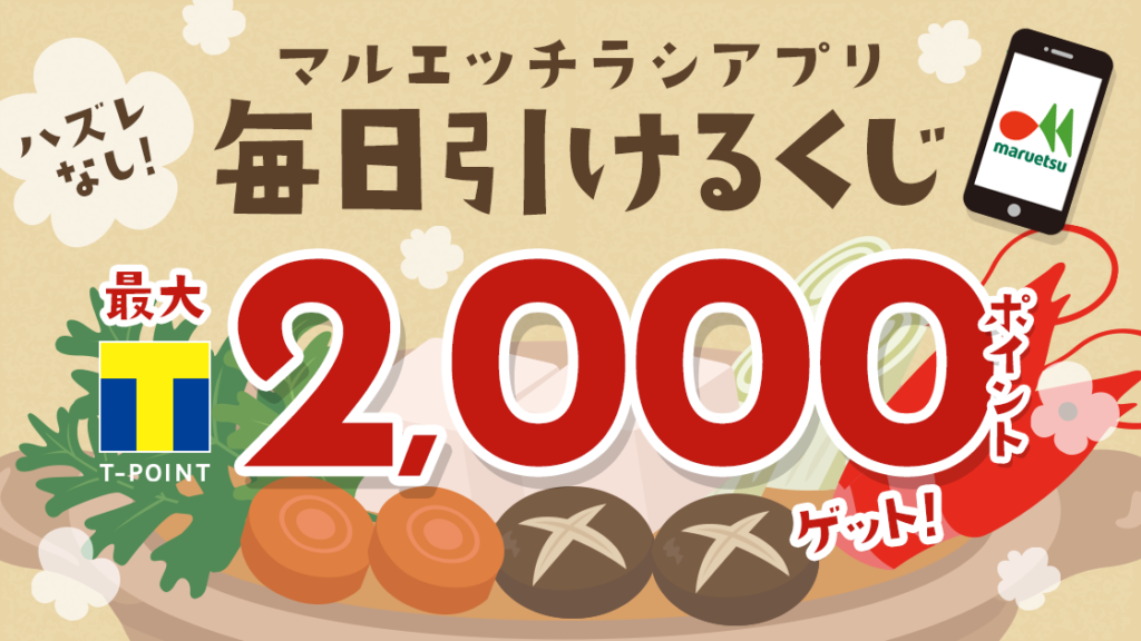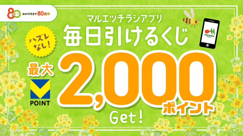 毎日引けるマルエツチラシアプリくじの紹介。Vポイントが2,000ポイント当たる!