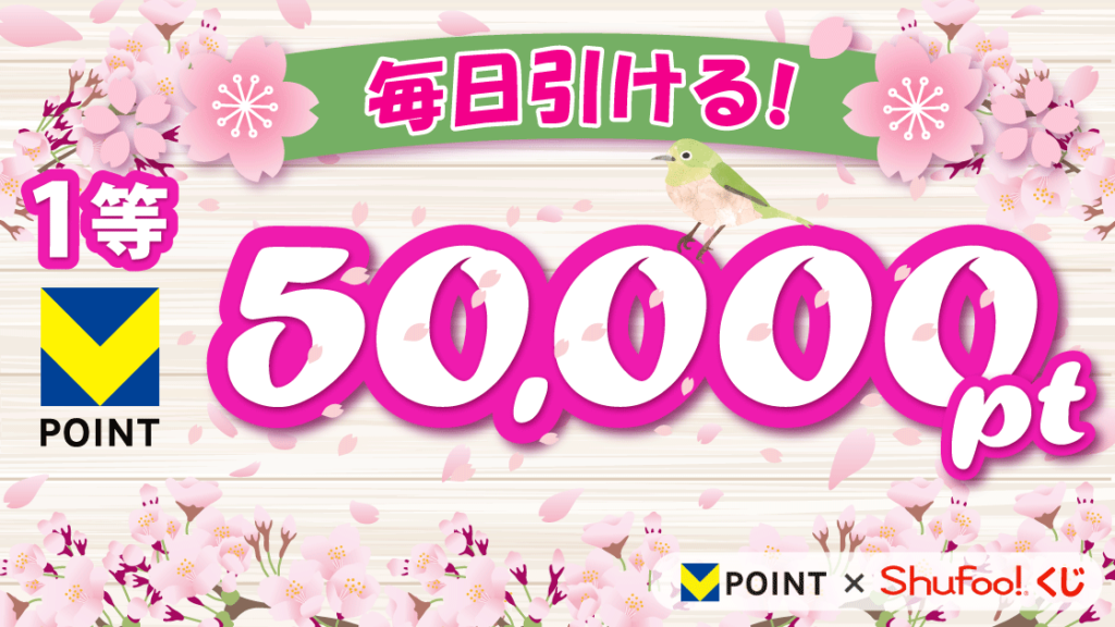 Vポイント×Shufoo(シュフー)アプリくじの紹介。Vポイント5万ポイントが当たる