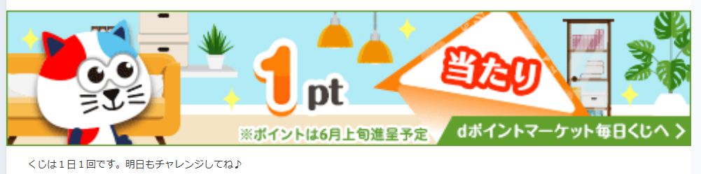 今回のポイ活くじは、毎日引けて、dポイントが当たるdマーケットのくじ(以下、4月の新生活くじ)です。